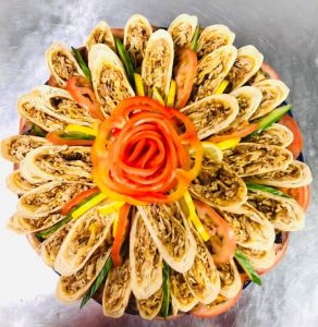 Yufka Falafel7,50 €Gerollt mit Salat, Tomaten, Petersilie, saure Gurken, Sesamsoße 8,n